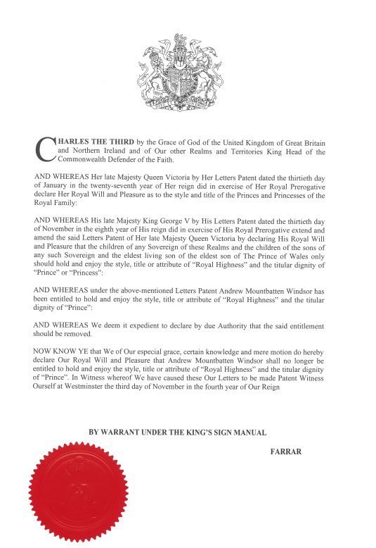 „Андрю Маунтбатън Уиндзор вече няма право да притежава и да се ползва със стила, титлата или атрибута „Кралско Височество“ и титулярното достойнство „Принц“.