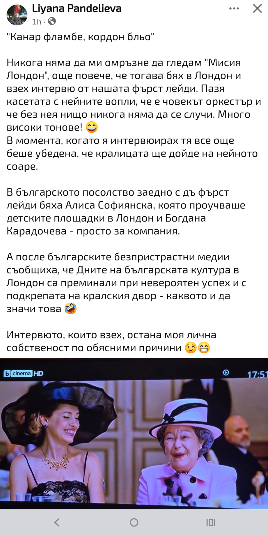 Панделиева е споделила това за Мисия Лондон 😅аз знаех, че прототипът е Стоянова, но мислех че като цяло е измислица черна комедия 😅още по смешно ми е сега