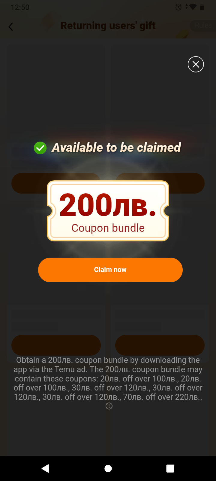Първо дава оферта за купони и като я затворите ви дава купоните от кода, без поръчка.
