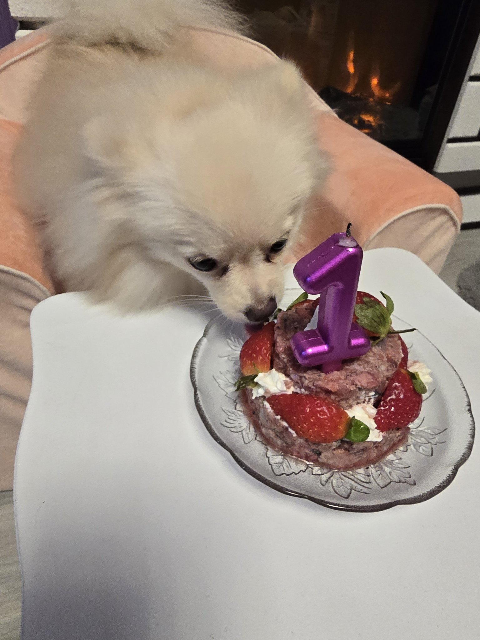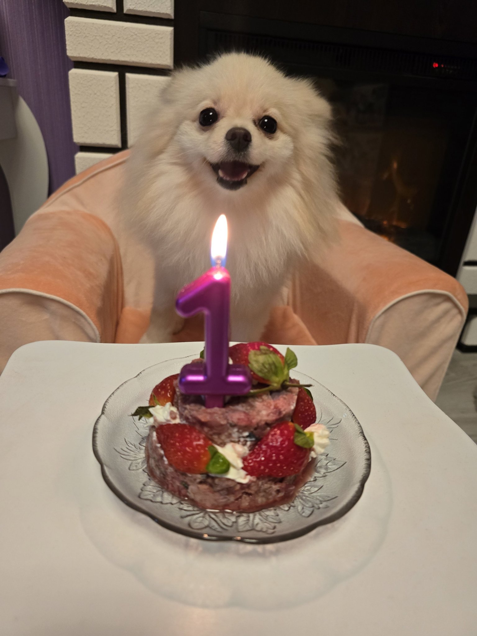 Ето и обещаните снимки. Голяма хитруша от истинския огън от свещичката я е страх, а от фалшифия на камината не. Обаче как угасихме пламъка веднага я отпочна, естествено първо с ягодите Joy