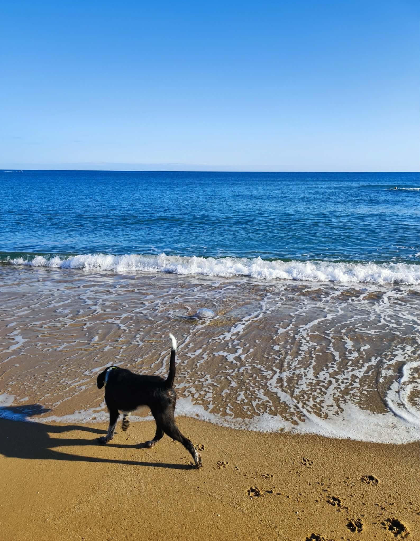 Мокри само лапичките и тича с вълните. Видя доста кучета и контактува с тях. Доволна съм, хубаво е да има запознанства.