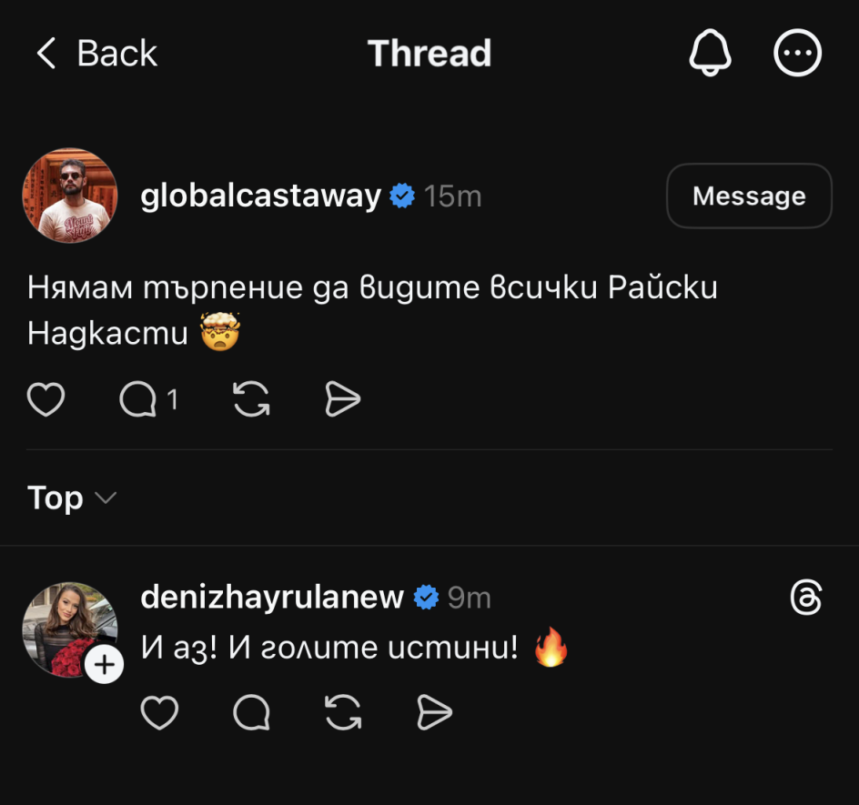 Слушах малко Натали в Надкаст, но вече ми е все тая за предаването, честно казано. Наистина е различна. И определено трябваше да се държи така и с онези вътре, а не да ги оставя да се опитват да я принизяват, просто защото са супер несигурни в себе си и това, че е по-харесвана от тях и може да си позволи да разиграва по сценарий и двама, и трима, и повече, ако беше пожелала, ги влудява. По никакъв начин не я намирам за глупава, даже обратното. Но толкова хаотично и неподредено говори, че трябва много да се съсредоточа да слушам, за да й проследя мисълта  и да я разбера. Чудя се в кой дом и знак й е Меркурий 😅