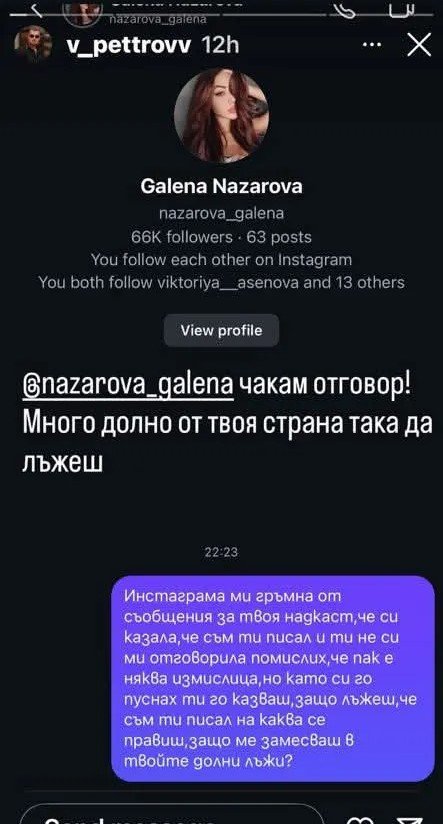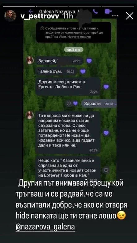 Тес Дърбървил, В. Петров е Валентин-Ивайло- Батката. Галена в Надкаст каза, че ѝ е писал и той се взривява, че това не е вярно. Втория скрийншот го разбирам така -Батката има папка с компромати и вади наяве част от тях, а именно, че жадната за слава Галена се моли на жълтите драскачи да я отразят в медийното пространство. Имал и още, но е възпитан и поне засега ще сме в невидение.