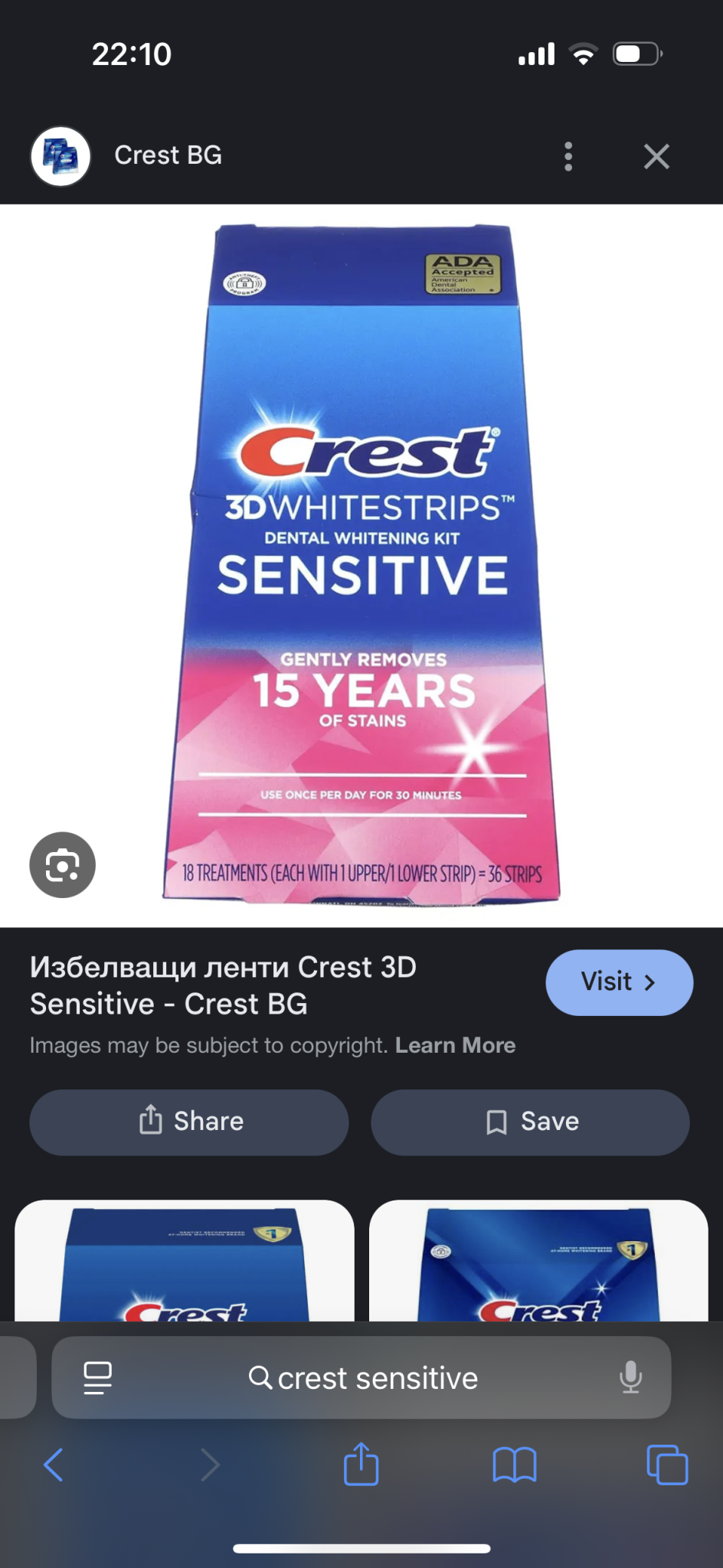 От много време им се чудя на лентичките Крес, но така и не се навивам да ги взема и пробвам, точно това ме притеснява силна чувствителност след тях. Имам опасения, че ще си съсипя зъбите и си стоя мирна на дупето.