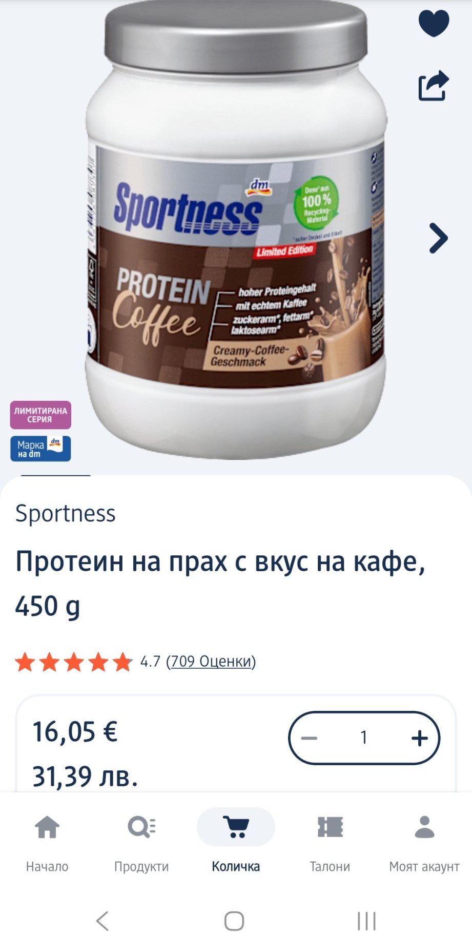 Вчера мислих, премислях и накрая с купона за -20% за един продукт си взех буркан от протеина с кафето. От всички козметично и парфюмно имам запаси и цялата ми онлайн поръчка от близо 83 лева след отстъпката включваше разни консумативи, да изпреваря вдигането на цените им. Сдухана работа, щом не си и помислих да си поръчам нещо за душата. А, освен чая с какаото Laughing
