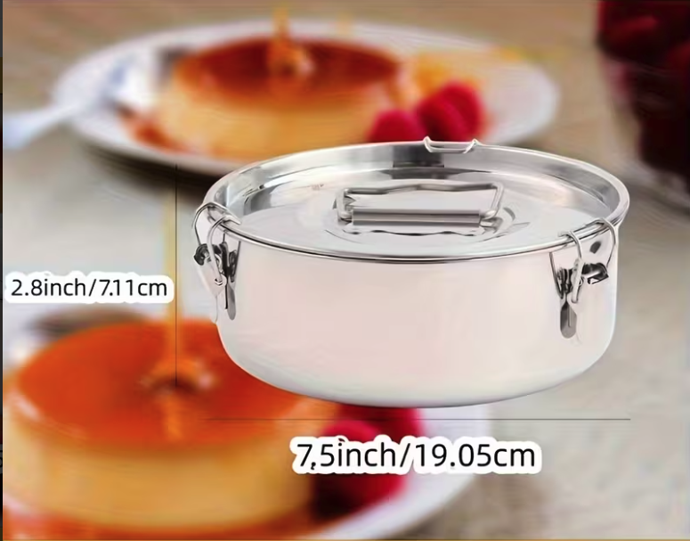 Не съм сигурна. Все пак ще се налива горещ карамел във формата. Гледам, че го правят и в отделни форми (шолички) за крем карамел, може и в стъклени бурканчета, колкото ще ти се поберат в съда. Можеш да пробваш да го направиш и в емайлираните паници, купи, ако имаш такава. Ей такава е моята форма. и си я купих от Тему
