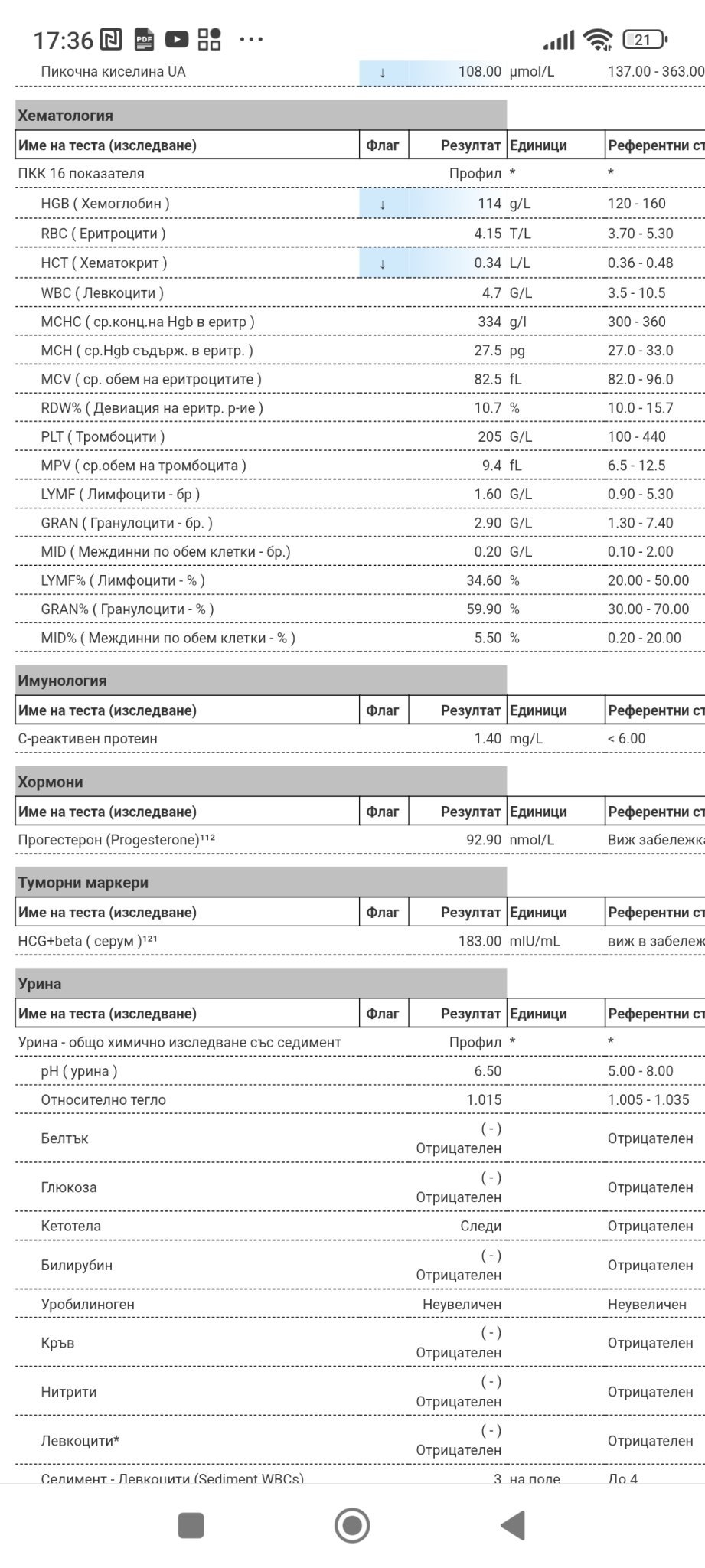 Еспресо, супер е резултата Simple Smile Но оправи си хемоглобина, че тепърва ще пада. Виж си желязото и ЖСК, защото и хемотокрита ти е нисък. Да не си с анемия?