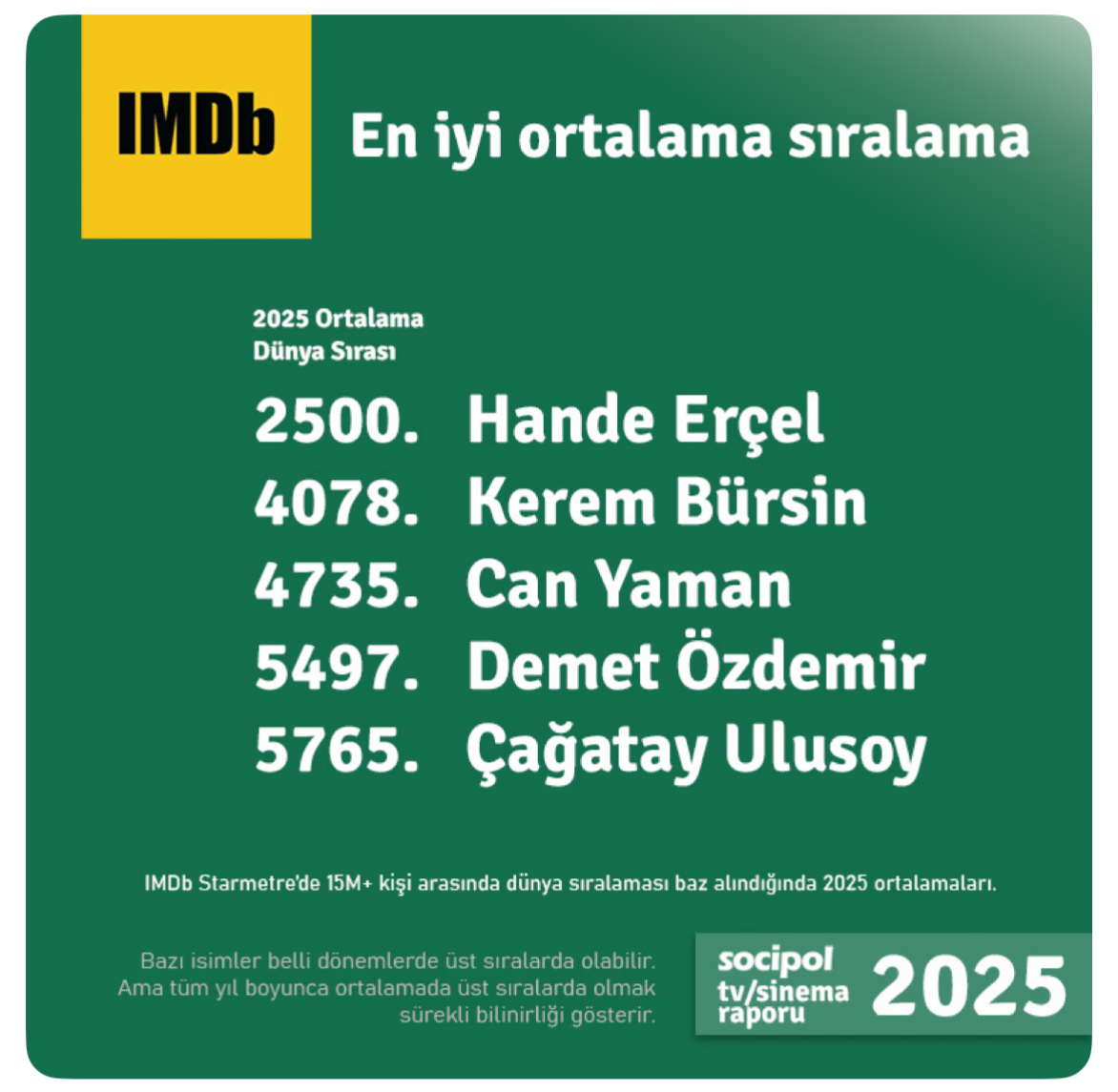 "Тази седмица (22-29 декември 2025 г.)  Ханде е класирана на 2-во място сред турските актьори в #imdb Starmetre. Тя е класирана на 3564-то място сред над 15-те милиона актьори, регистрирани в IMDB по целия свят."