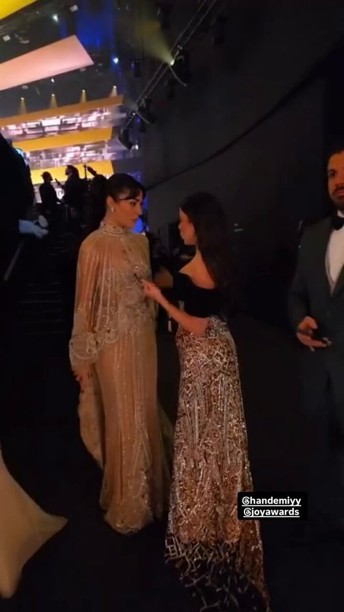"#HandeErçel сподели снимка в Instagram историята си на египетската актриса Амила Халил, с която тя се снима за корицата на Vogue Arabia миналия юли. ✨Амила Халил отговори: „Беше страхотно да те видя, любов моя! И колко сладка беше Хандемийи, докато говореше арабски на сцената??💖“