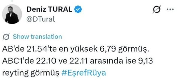Рейтингът на Eşref Rüya в категория AB достигна пик от 6,79 в 21:54 часа.