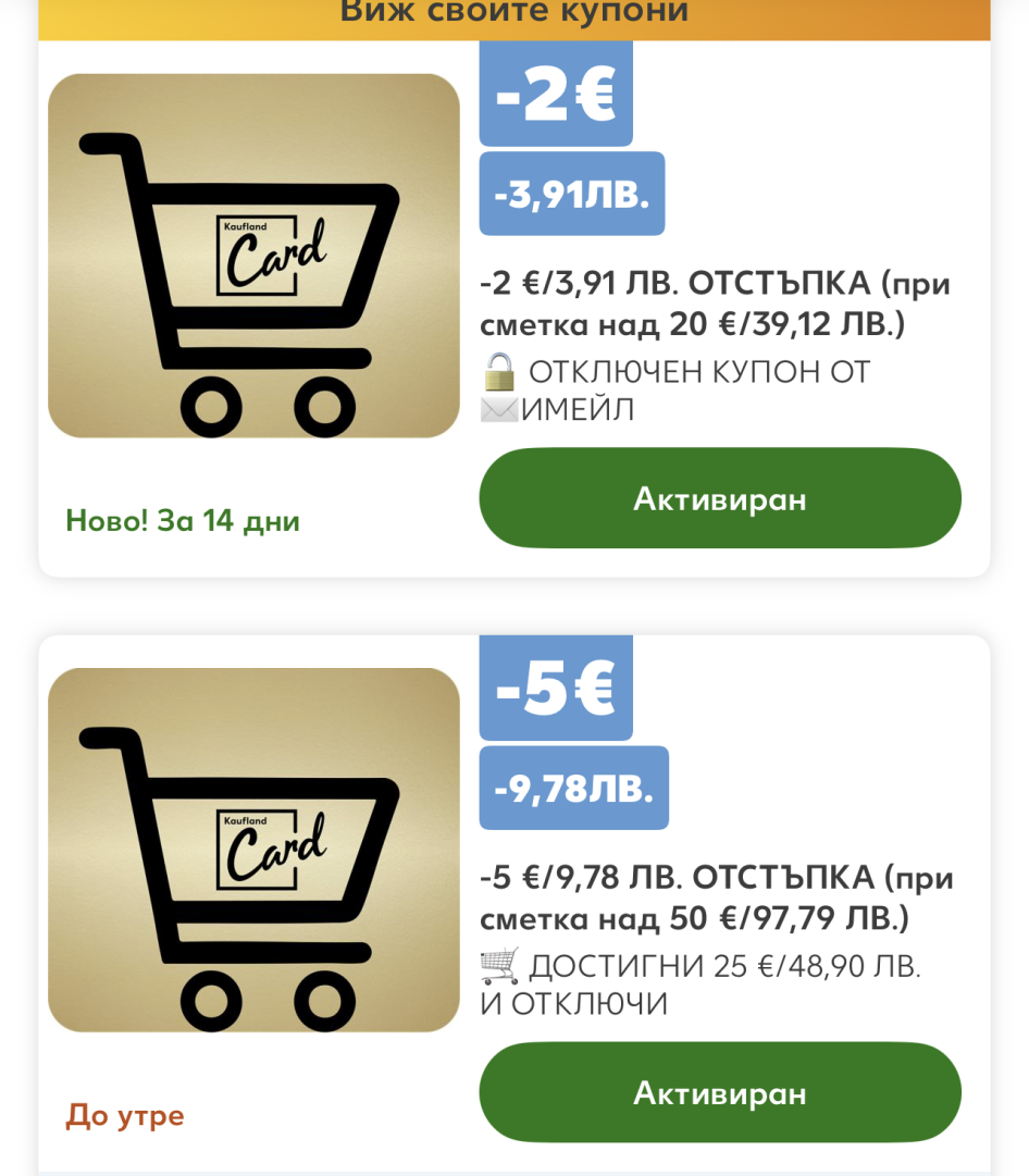 И аз имам такъв купон и няма да мога да го използвам, тъй като К. ни е кварталният магазин, търчим ежедневно по няколко пъти до него, т.е. сметките големи, но в много покупки.