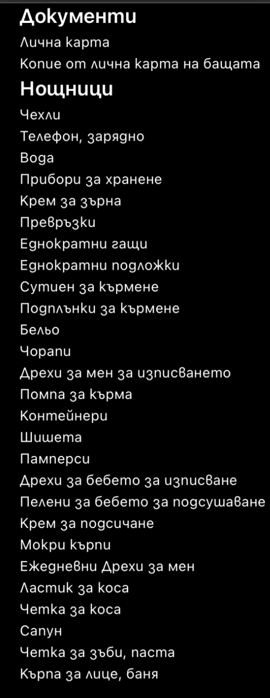 Аз съм си сложила и хавлия, превръзките за след раждане, чорапи, бельо също, четка паста за зъби, ролон, едно сапунче, помпа за кърма, крем за зърна, нямам само подплънки за кърмене ама те необходими ли са не знам, също ще си сложа някое клинче и тениска. И дрехите за бебчо за изписването ще са си с мен. Общо взето ще гледам всичко да си взема, че пътя от нас до болницата е час и няма да карам мъжа ми да търчи за някакви неща ако не се наложи нещо де. И четка за коса също