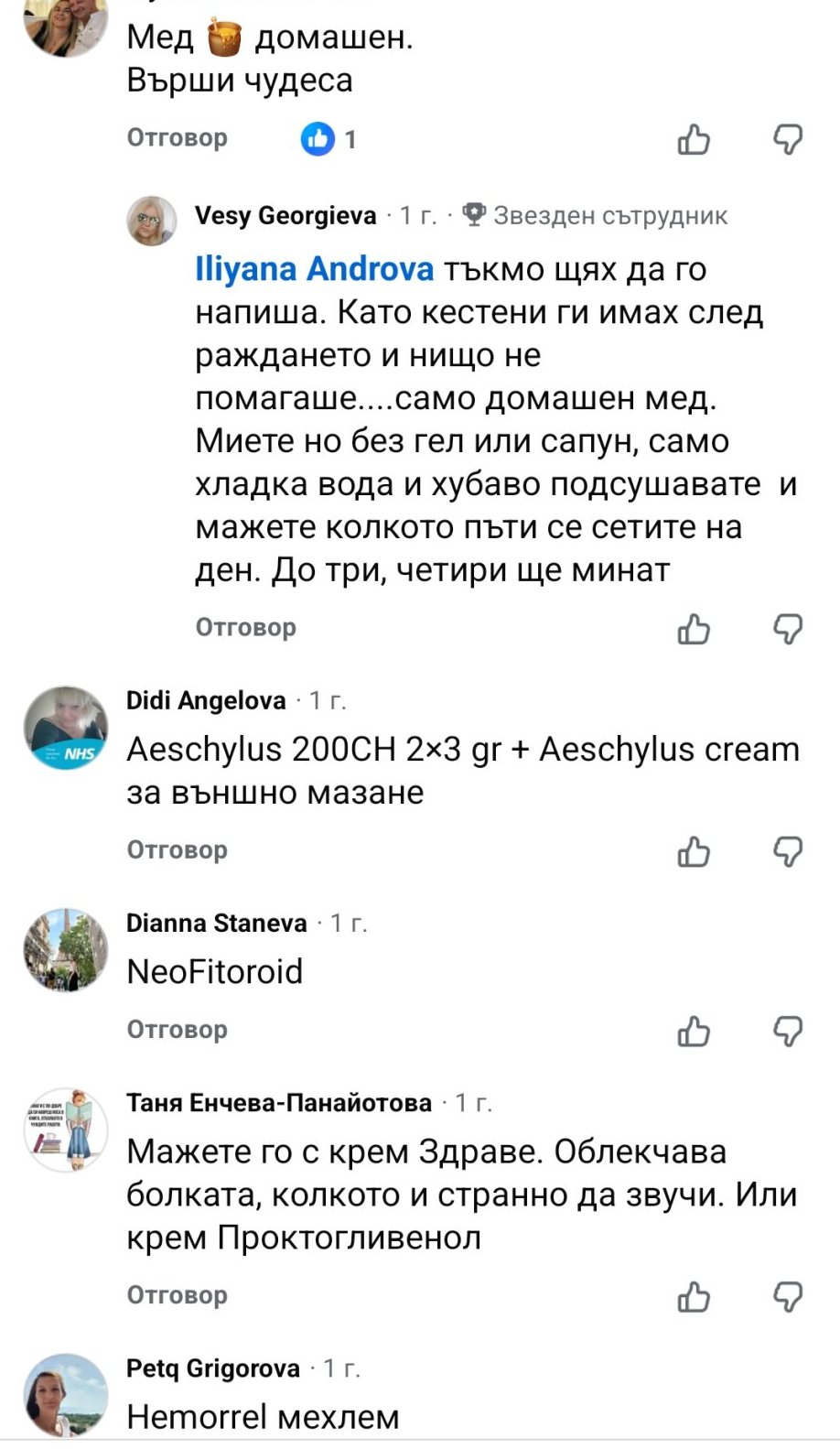 Аз си купих 2 вида хомеопатични топченца на boiron за хемороидите. Пишеше ги в една книжка, точно за бременни, проблеми и хомеопатия. Не виждам ефект, ама си ги пия, не знам вече като са се появили дали ще се приберат... Имах 1 от предишната бременност, сега май още 2-3 са цъфнали.. мислех да питам АГ предишния път на прегледа, но не съм. Мажа с мед 3-4 пъти на ден, качвам ти скрийншот от група с коментари по темата.
