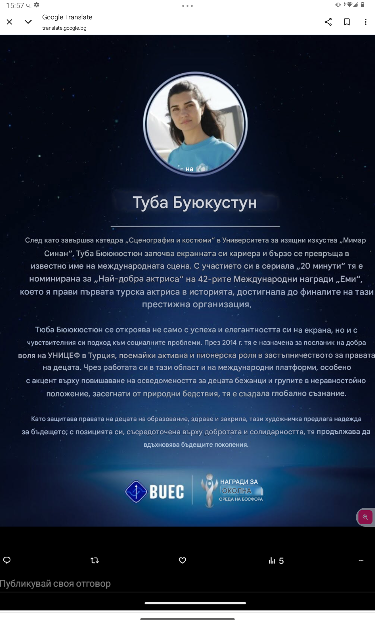 Туба Бююкюстюн, носител на специалната награда на BUEC „Надежда за утре/бъдеще“ ✨ Изразяваме искрената си благодарност към нея за нейната работа 💗