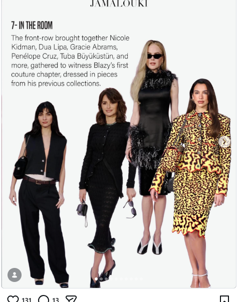 Компанията наистина е звездна! Даже говорят, че на дефилето е присъствала Анна Уинтър. Тя  е главен редактор на американското списание „Вог“, която позиция заема от 1988 до 2025 година. Със своята късо подстригана коса и слънчевите си очила, Уинтур се е превърнала в институция в света на модата. Със своя строг поглед към модните тенденции, тя е успяла да си спечели прозвището „Ядрената Уинтър“. Прототип на дамата от „Дяволът носи Прада“