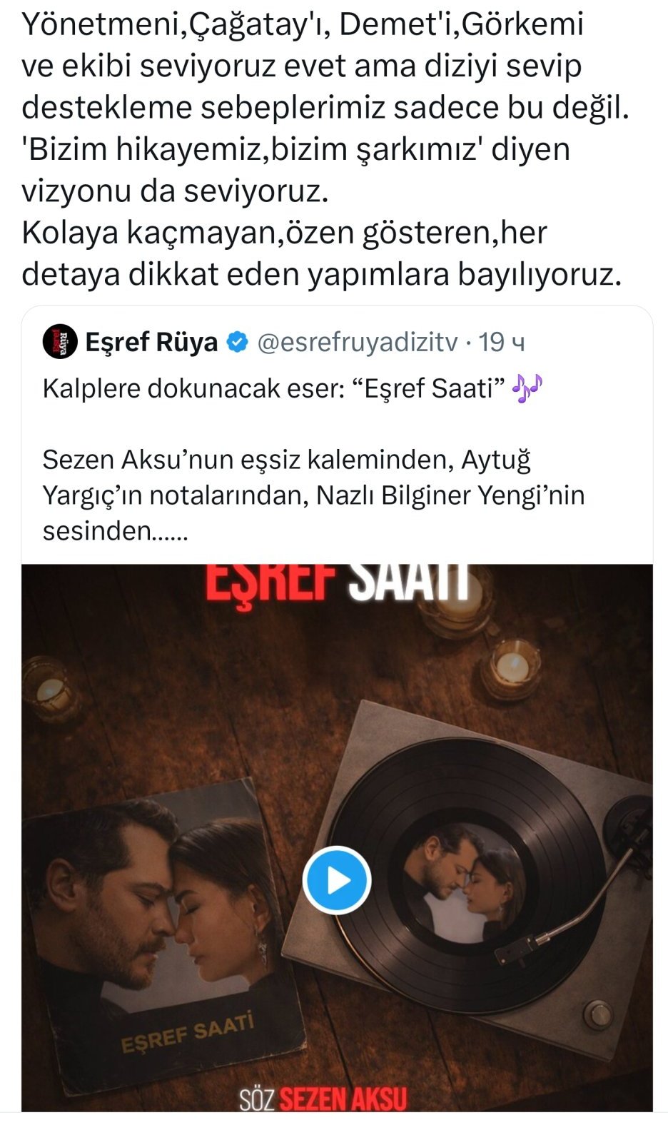 Да, ние обичаме режисьора, Чаатай, Демет, Гьоркем и екипа, но причините ни да обичаме и подкрепяме сериала не са само това. Харесва ни и визията, която казва: „Това е нашата история, това е нашата песен.“ Обожаваме продукции, които не поемат по лесния път, които са прецизни и които обръщат внимание на всеки детайл.