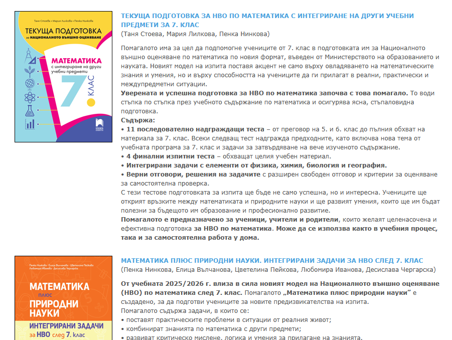 Shushi2, показаният сборник на Просвета го купих сега по празниците. Не сме започнали да работим по него, но като първо впечатление - интегрираните задачи са по-сложни и изискват повече време за изчисления, спрямо оранжевата книжка на Просвета и ПИ на БГУчебник. Според мен и останалите задачи са по-трудни от ПИ на БГУчебник. Тук са дали един от тестовете