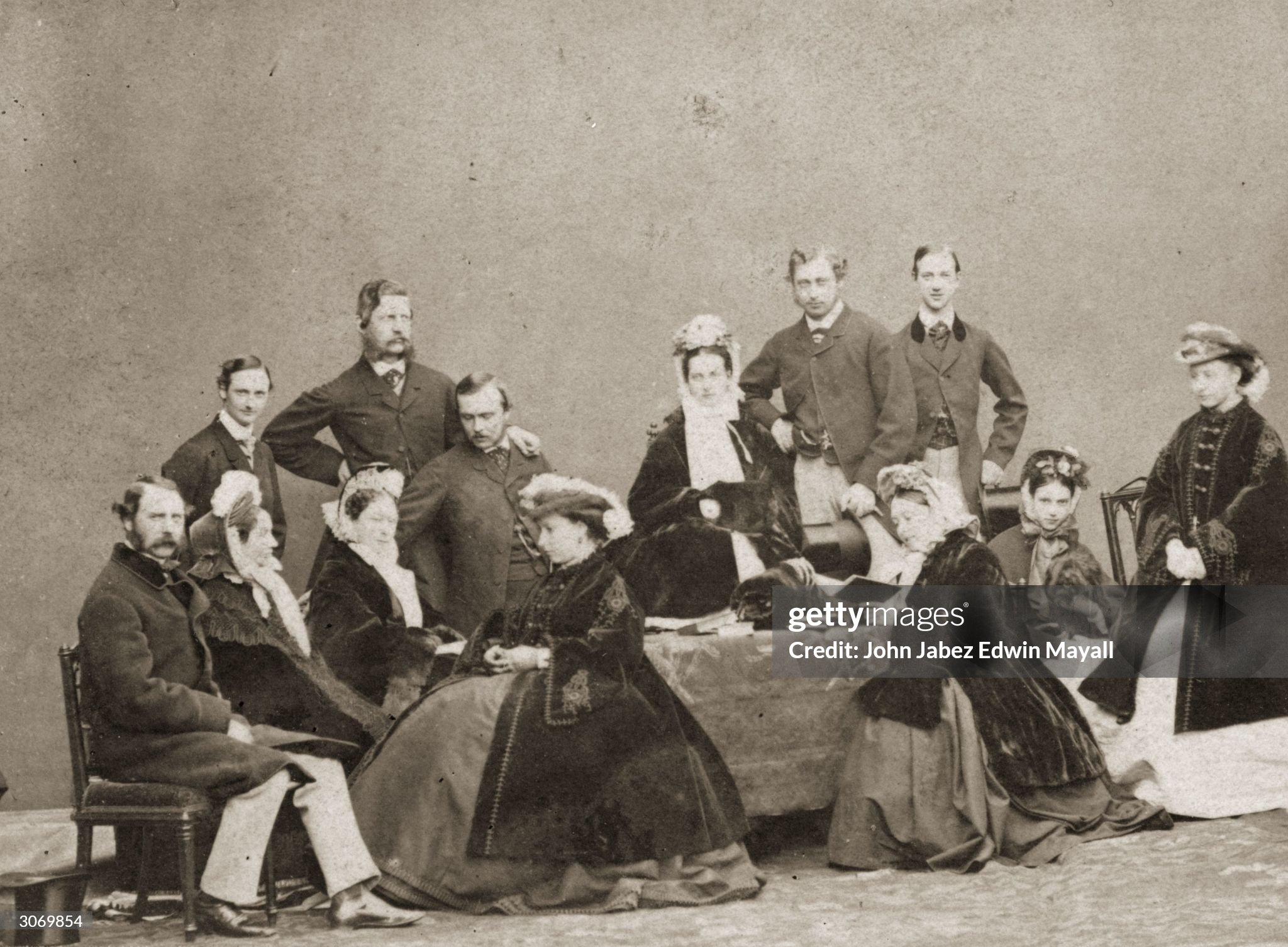 Кралица Виктория и нейното семейство, Уиндзор, 1863 г. Снимка от албум на кралското семейство в Осбърн Хаус, остров Уайт. Снимка, вероятно направена по време на сватбата на принца на Уелс, като семейството е подредено около бюст на Алберт, покойния принц-консорт. Правостоящи (отляво надясно) - принцеса Александра Датска, принцеса на Уелс (1844-1925); принц Алберт Едуард, принц на Уелс (1841-1910); принцеса Елена (1846-1923): великият херцог Луи Хесенски (1837-1892). Отпред (отляво надясно) - принцеса Алис (1843-1878); кралица Виктория (1819-1901); принцеса Беатрис (1857-1944); принц Леополд (1853-1884); вероятно престолонаследницата на Прусия (1840-1901).