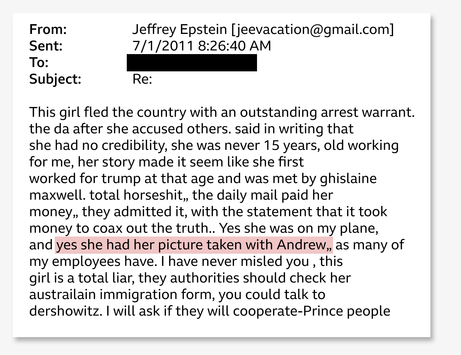 Той казва, че диалогът между престолонаследницата и Епщайн има флиртуващ или дружелюбен тон, докато Епщайн поне веднъж я описва негативно зад гърба ѝ.