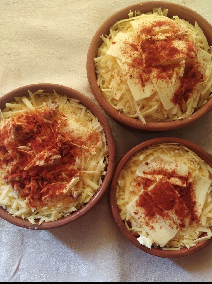 Настъргана и на пластове. В едното има пръжки по средата, а в останалите сирене и кашкавал. Отгоре масло и пушен червен пипер, кОпаш, ядеш и ревеш.