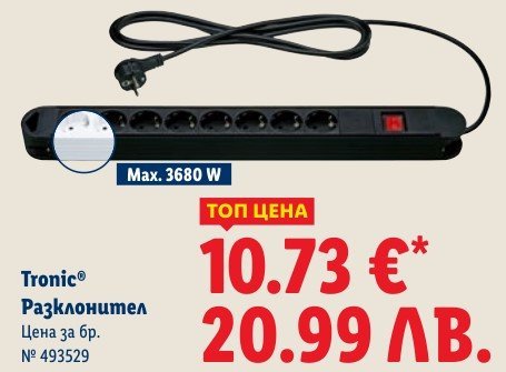 В брошурата от следващата седмица разклонителя е с повече гнезда и съответно по-скъп. Този по-евтиния го имам в бяло но смятам да взема и от дългия тъй като под телевизора съм понадила 2 разклонителя от много у-ва Simple Smile Освен това пише в тази чужда брошура че разклонителя е 70% намален от 17 евро а при нас редовната му цена е 10 евро - молете се да не станат цените като чуждите че тогава ще береме ядове Simple Smile
