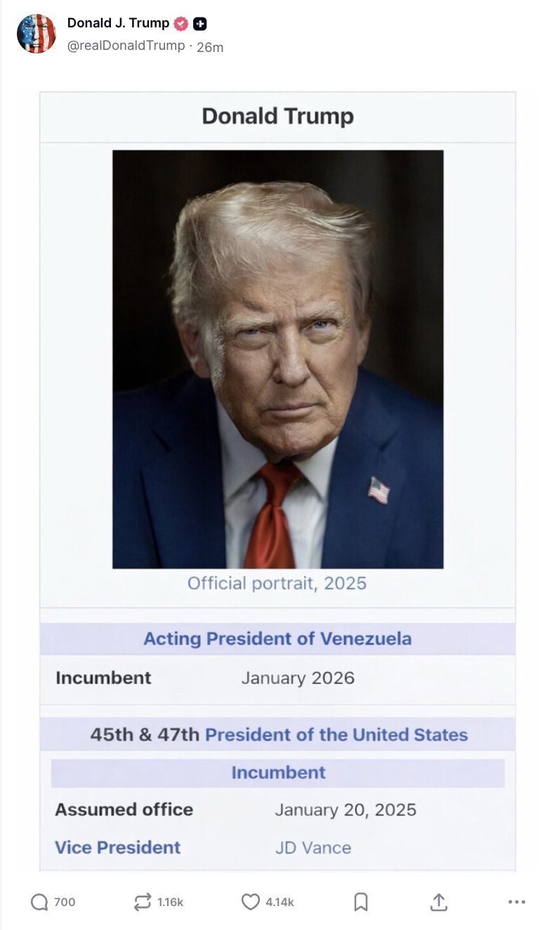 Ау, оказа се, че Тръмпакът не е такъв Освободител и част от хората може и да не са доволни от неговите планове. Сега ако настане и гражданска война (дано, дано не), каква ли сигурност ще имат петролните компании да инвестират там...