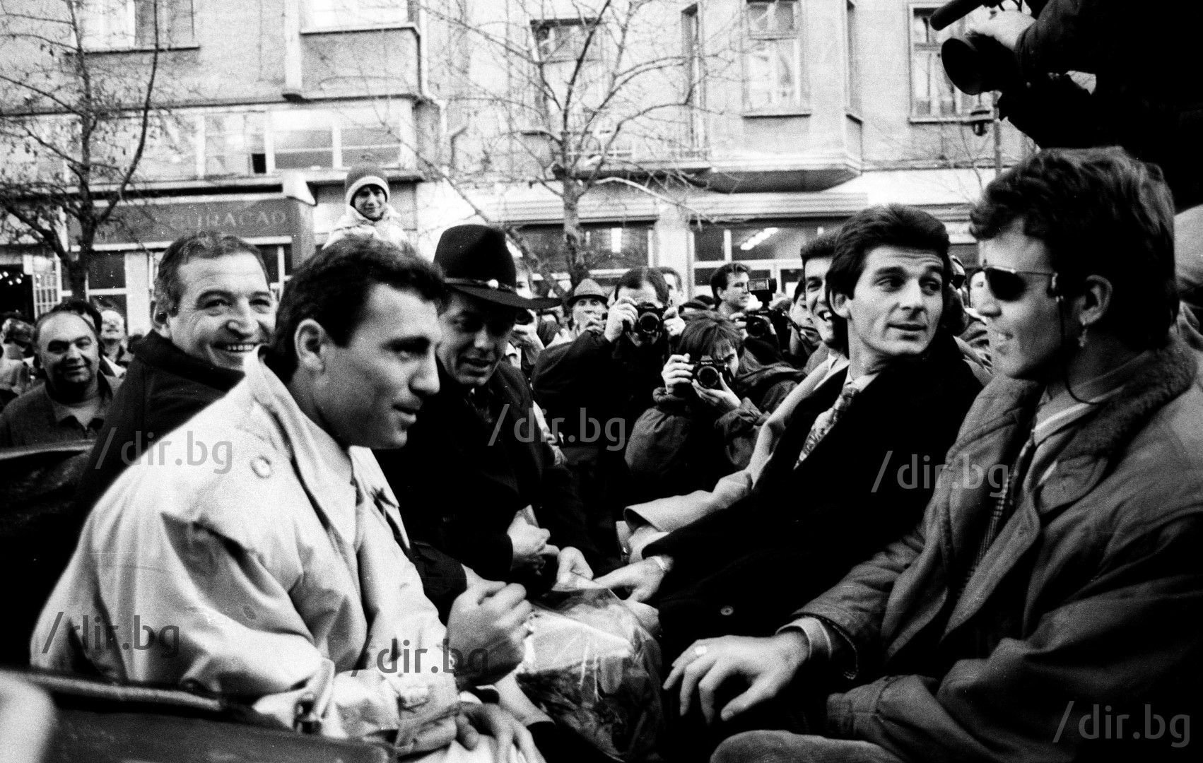 Преминаване с каляски в центъра на София след триумфа на "Парк де Пренс". В тази на Старшията са Наско Сираков, Емо Костадинов и Христо Стоичков :