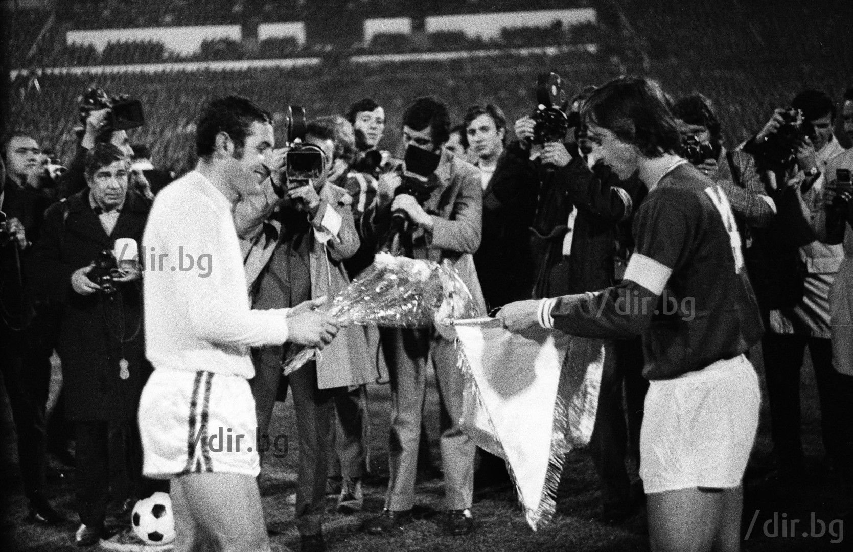 Преди ЦСКА - Аякс през 1972 г. в София. Двамата капитани - Пенев и Кройф, разменят флагчетата на клубовете :