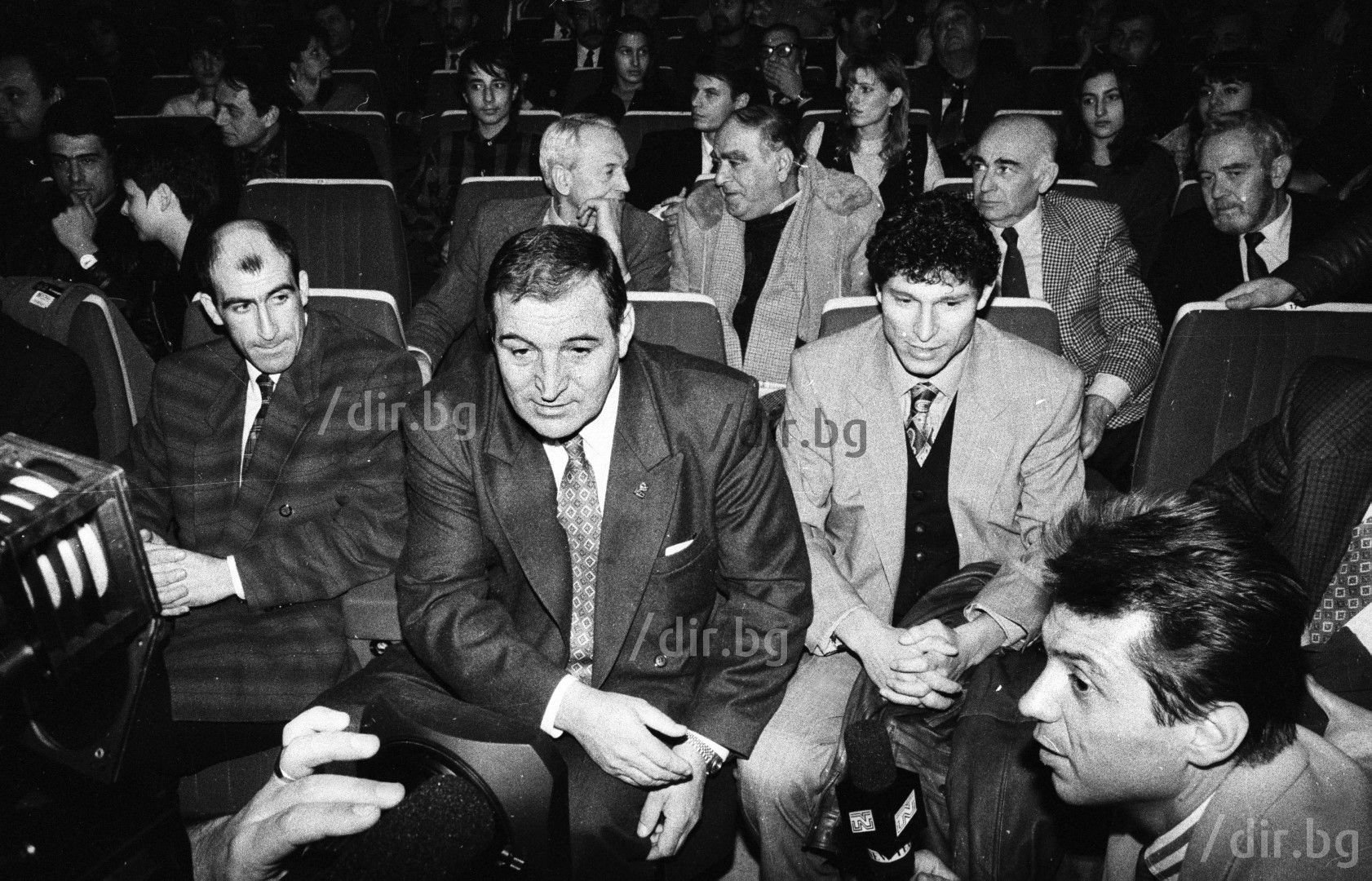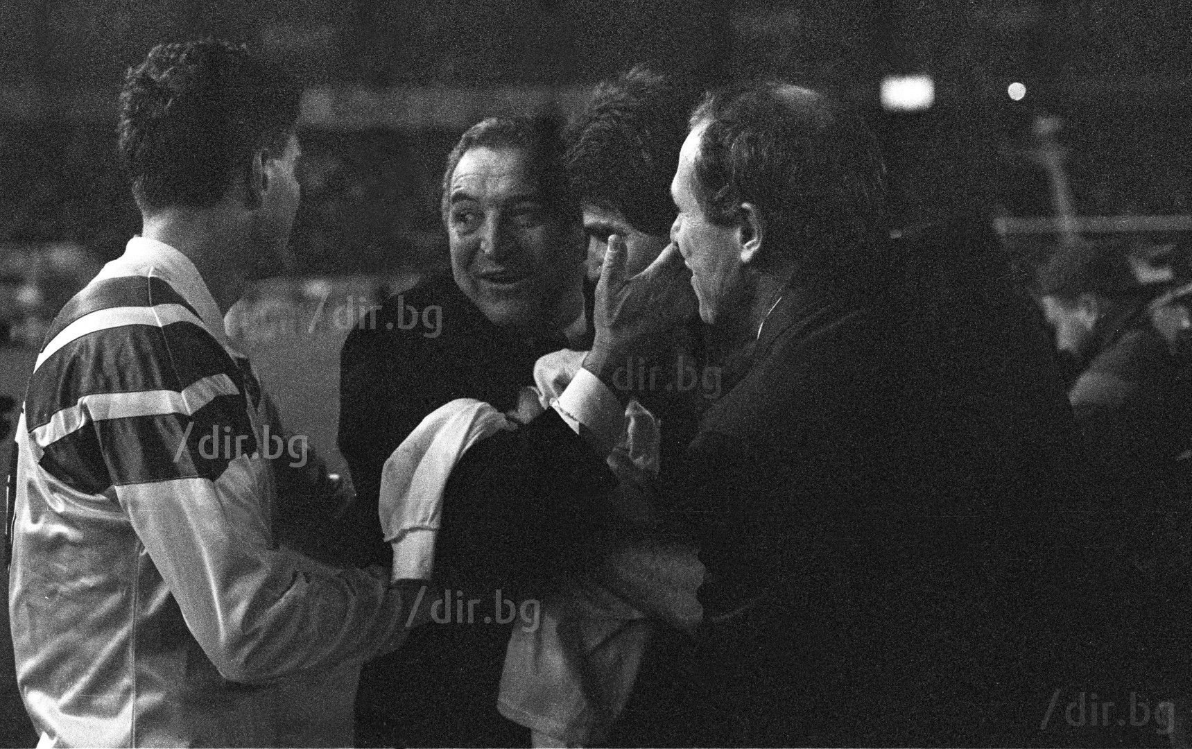 17 ноември 1993 г. - Триумф! Пената, Емо Костадинов, Петър Александров и помощникът Краси Борисов плачат от радост след последния сигнал :