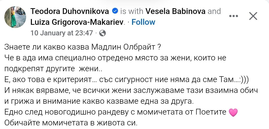 Духовникова не изприказва ли сума ти глупости за Диана Димитрова по времето на обвиненията срещу Вергов, та сега да пише за жени, които подкрепят жени 🙄