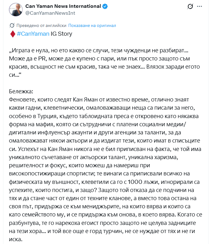 Аз споделих само част от сторитата, които Джан публикува тази нощ. Това, в което се обяснява, беше насочено не само към турските медии, а и към турците, които го коментират в СМ.