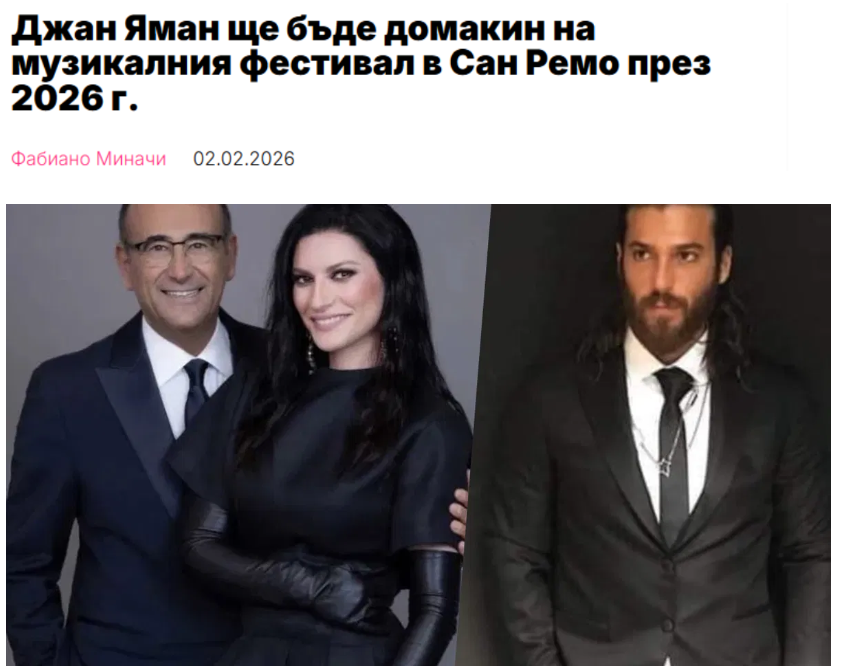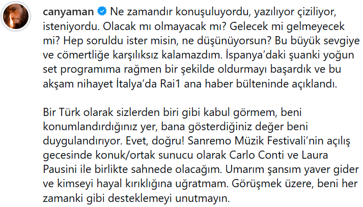 Джан Яман , който си е изградил име с кариера, простираща се от Турция до Европа, този път ще участва в едно от най-големите събития в италианския телевизионен свят. Яман ще бъде ко-водещ на откриващата вечер на Музикалния фестивал в Сан Ремо през 2026 г.
