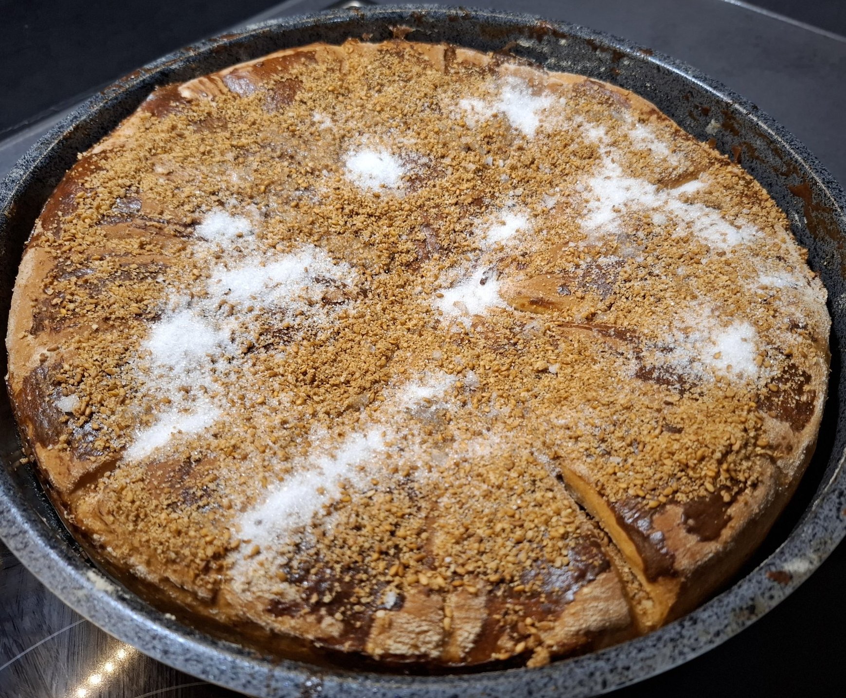 В тава с диаметър 30 см. се разтапя маслото, нареждат се бисквитите, ябълките, смлените орехи и най-отгоре се изсипва кексовата смес. Пече се около 40 мин. на 200°-220°. Като изстине се поръсва с пудра захар.