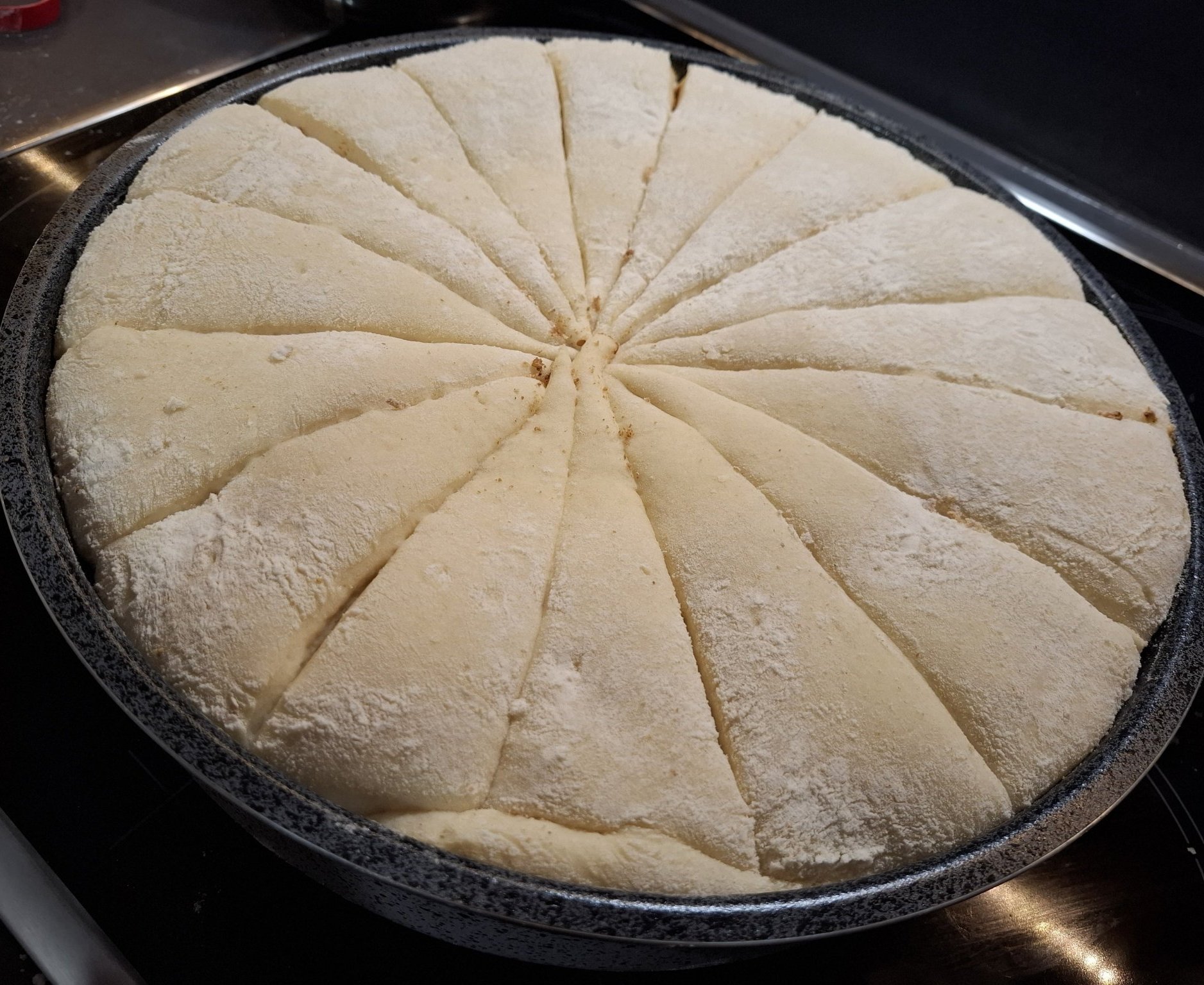 Разделя се на 4 топчета.Всяко топче се разточва по размера на тавата, маже се с тахан и се поръсва със сусам. Така се редуват и останалите кори като се слагат една върху друга.След това се нарязва на триъгълници и се оставя да втаса до удвояване на обема си. Маже се с с жълтък и се поръсва със сусам.