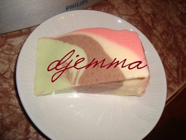 Жълтъците се разбиват, прибавят се брашното и ванилиите. Желатинът се разтваря в 1 ч.ч. пр. мляко. Останалото мляко се сварява с 1 ч ч захар, прибавя се жълтъчната смес. Савярва се на лек крем, отстранява се от котлона, прибавя се желатинът и се оставя да изстине. Отделно се разбиват белтъците с 1 ч.ч. захар на твърда пяна и се прибавят към крема лъжица по лъжица. Сместа се разделя на 4 равни части, в първата се слагат смлените орехи, втората се оцветява с какаото, третата се оцветява в червено, а четвъртата в жълто.