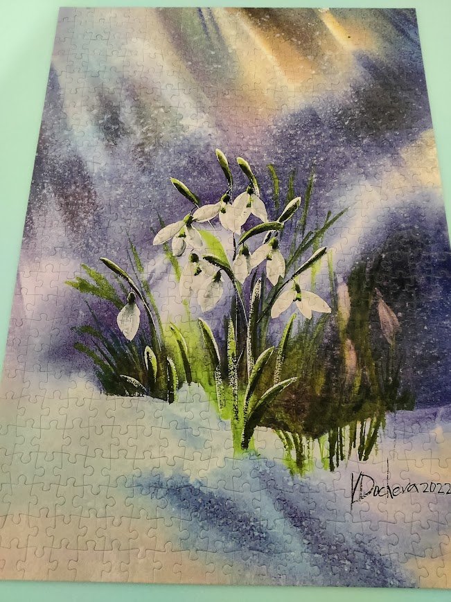 Пъзелът е нареден. И едни кокичета от 500 бр. наредих. Залепени са и чакат да ми дойде музата да ги рамкирам.
