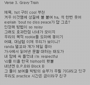 Те наистина влизат в сърцето ми [наистина ги харесвам]. Уважавам VJ, който наследява факела на корейския хип-хоп.