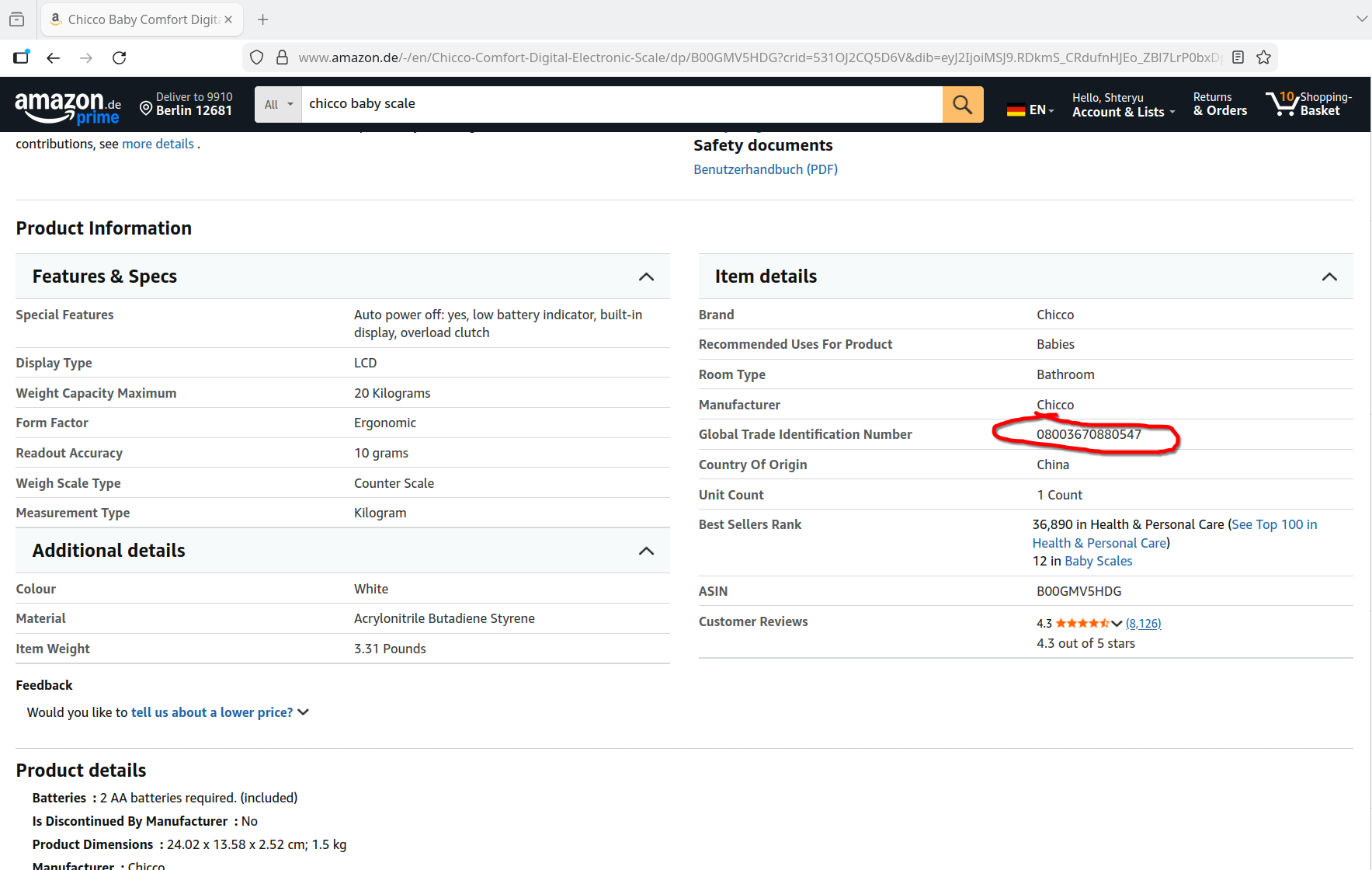- Цена в Германия(amazon.de) с