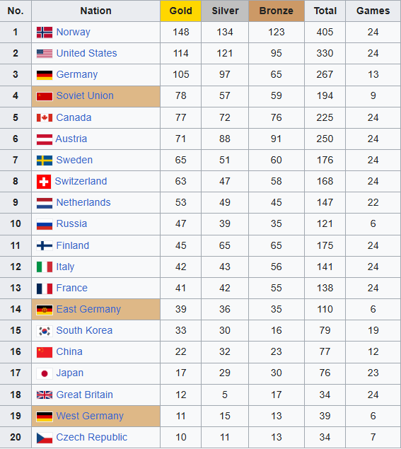 Вечната класация по медали от Зимните олимпийски игри (1924 - 2022) (топ 20)