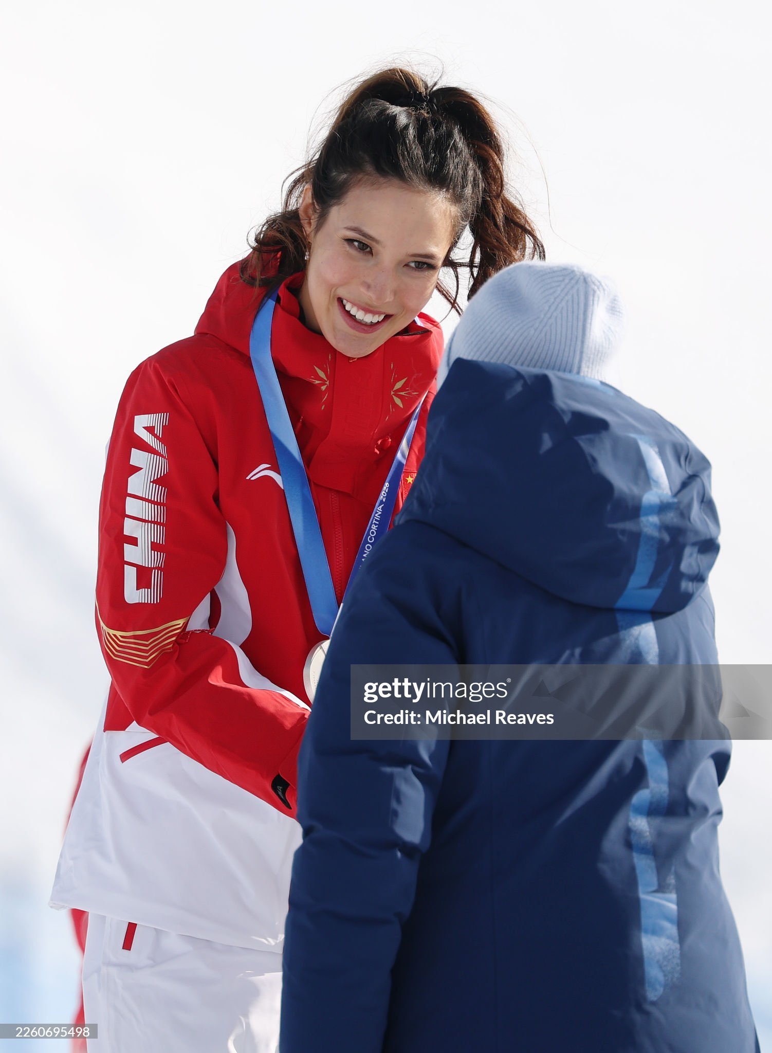 Принцесата Ан, член на МОК, се ръкува със сребърната медалистка Айлийн Гу от отбора на Китай след финала по слоупстайл за жени на третия ден от Зимните олимпийски игри Милано Кортина 2026 в снежния парк Ливиньо, Италия, днес.