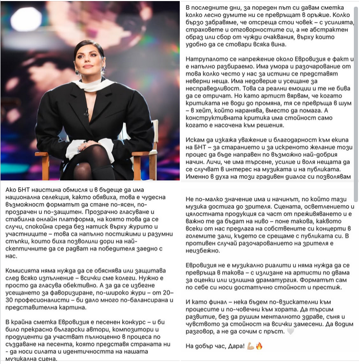Накрая знаете ли какво ще излезе - България е решила да участва, измислили са този абсурден конкурс, свързали са се с ДриймТийм и те са казали: супер, надяваме се да е Дара! … и БНТ са омазали положението, за да се подмажат, та го отнесоха изпълнителите.