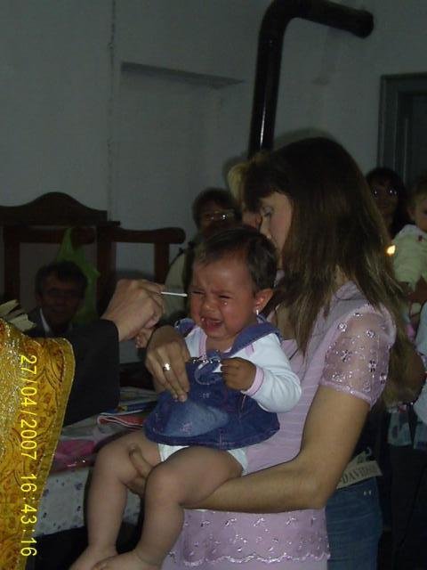 реших да кръстя малчо на рождения и ден, милата много плака, не знам дали от това че не я държеше мама или от обстановката. "Пукна" ми се сърцето докато свърши церемонията и сега вече е христянче.Попа малко се шашнат , че нямаме  татко , но бързо го преодоля, каза "разбирам" и продължи с попълването на свидетелството
