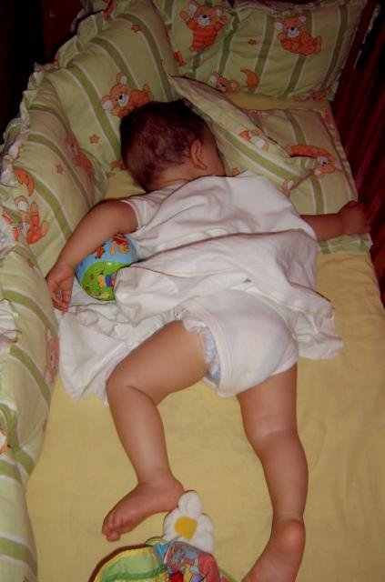 И моята Поли спи по корем,след като се повърти из цялото легло,най-често заспива по корем.За сега казва само та-та,но когато тя си иска,в останалото време си говори нещо на бебешки,но моя милост,нещо я неразбира
