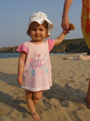 От няколко дни са я замъчили първите 2 кътника, през деня се кисели, а нощем много се буди, плаче и я вземам при нас да се гушкаме. Като изключим това мога само да я похваля, че вече започва да се държи по-добре-много рядко ни дере, хапе и скубе(мен и татко си), вместо това ни милва по лицето Grinning Като направи нещо, което знае, че не одобрявам, започва да вика: "ау, ау, ау". Понеже не ми казва мамо, започнах да й повтарям, че съм мама мими и днес тя на няколко пъти ми каза:"мими, мими". Много обича да си играе с къщичката с формички, справя се отлично, но по някога (явно като е разсеяна) слага формичките не където трябва, ядосва се и започва да ги блъска. С прибирането от площадката нямаме напредък. Всеки ден, като си тръгнем започва страшен рев и тръшкане по земята! Носим я под мишница, тя размахва крака и ръце във въздуха и пищи... Целият квартал ни научи вече(и по другите площадки сме така, не само на нашата) Embarassed За компютъра-борбата е основно за клавиатурата, самата кутия е на неудобно за нея място и засега не го е спирала, но пък копчето за пускане/спиране на телевизора е една от любимите й играчки.