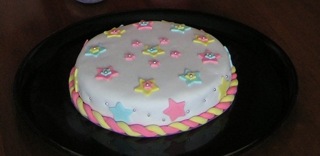 Искам да ви покажа резултата от моя първи допир до фондан. Украсата е елементарна, но се надявам занапред да се поусъвършенствам в различните техники.