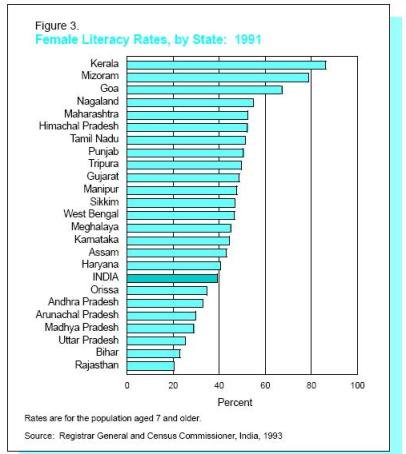 Жените в Индия все още отстъпват по образованост на мъжете, като има значителни разлики между селските и градските райони и между самите щати. Ето една графика от 1991 г.