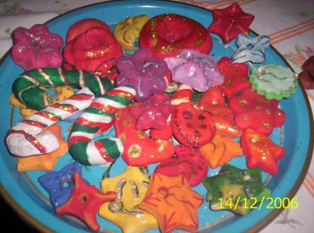Много лесно се правят - като сладки.  Laughing Глината се разточва на тънка кора и с форми за сладки се изрязват играчките. Изчаква се няколко дни, за да изсъхнат и след това се боядисват. Пак се чака хубаво да изсъхнат и могат допълнително да се украсят.