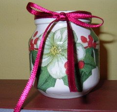 Здравейте, много бих искала и аз да се включа в изработването на неща за базара. Запалила съм се по декупажа и мисля да направя някои неща, но все пак съм още "боса". Ето това е една от първите ми работи, ако смятате, че може да се продаде като свещниче ще направя още.