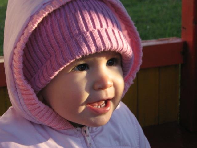 ,опитва се да казва някоя думичка,но смешно я произнася.Татко и я е научил,като види,че дават по телевизора мач и да вика "ГОЛ".Добре разбира кога е мач и толкова ентусиазирано вика "гол" с вдигнати ръце