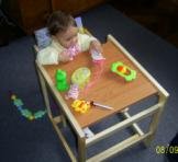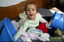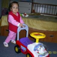 За игрите: най-обича да се гоним и крием, но това става само когато се върне тати от работа. Голям смях и крясъци... Влизат даже в гардероба... Когато сме сами: Обграждам я с играчки и книжки на леглото или на столчето и масичката (така си играе обаче не повече от 15-20 мин.). Обича да докопа една кофа в която събирам нейното пране, сяда на земята и вади дрехите една по една, в това време аз ги събирам в друга кофа и когато нейната е празна ги сменям, така откарваме доста време, но накрая започва да се ядосва, че дрехите все не свършват. Тика си камиончето и вика „Бруум, бруум”, а като му пусне мелодийките започва да денси – върти дупе, прикляква, пляска с ръце. Изобщо чуе ли музика големи танци падат. Люлеем се на люлка, която закачам на касата на вратата. Гоня я като й кажа „Чакай да те хвана” изведнъж подскача и тръгва да бяга със смях. Напоследък я карам да ходи и да ми носи разни предмети, или й подавам нещо и я пращам да го занесе на някой.